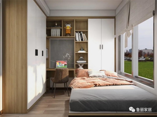 功能與顏值的相映襯可以為空間帶來更多的驚喜體驗。魯麗家居設計師在設計女孩房時便充分考慮這一層面,將空間轉角區域充分利用,在兩側衣柜拐角處做書桌設計連成一體,整體空間溫馨舒適又不失功能性,非常適合想要擁有多重功能的小空間。