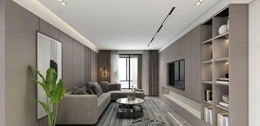 客廳整體采用灰色系空間,整墻電視背景收納柜與沙發護墻板呼應,搭配極簡風的沙發與地毯,布局簡單且處處充滿高級質感!