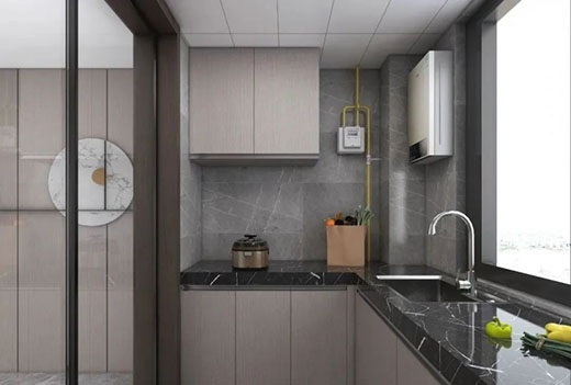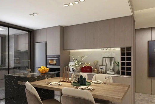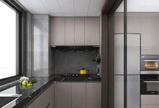 餐廳與廚房一體化設計半開式格局,與餐廳結合增加家人互動性,U型櫥柜增加了廚房的儲物空間,美觀性與實用性兼具。