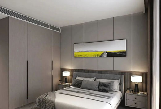 臥室延續整體空間色調,高級灰色系打造低調有內涵的舒適空間,一門到頂的衣柜搭配黑金拉手更顯高級。