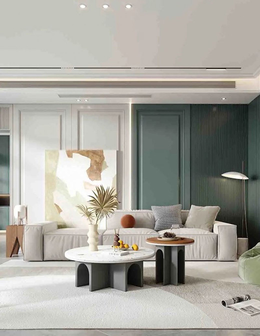 沙發的背景墻,派克綠和白色的拼色設計,明亮通透的白色中和掉了派克綠的厚重感,讓整個空間色彩更加平衡,加上線條的點綴,自然舒適且優雅,讓瑣碎的生活,也洋溢著精致的生活品味。