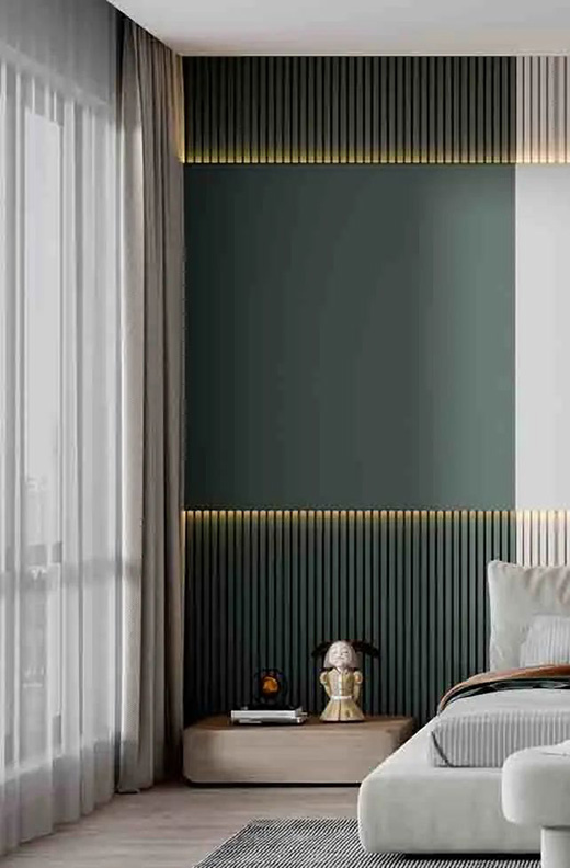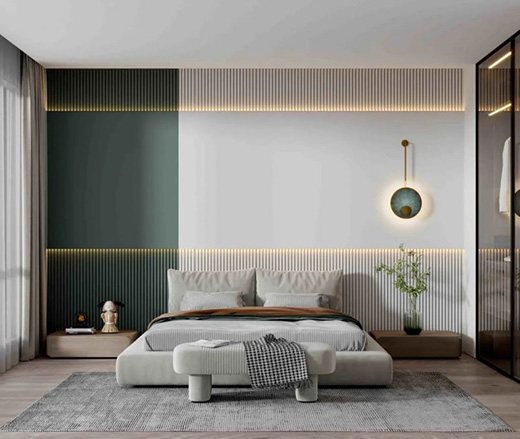 主臥室背景墻的設計和客廳的設計相呼應,明亮的白色和派克綠搭配,簡約清爽透亮又不失優雅,讓自然的氣息引進臥室里,讓靜謐愜意舒緩一天的疲憊。