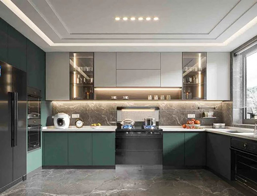 其實將綠色運用到廚房中,也是別有一番風味,派克綠和煙灰色的搭配,現代風和復古風的融合,營造出自然復古的高級感,在煙火味濃重的廚房也能,感受到來自大自然的氣息。