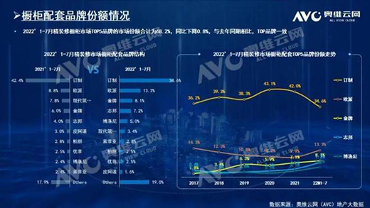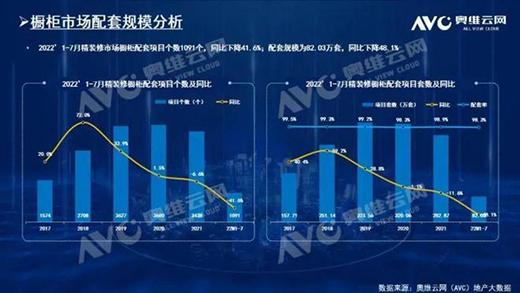 受到疫情反復、購房需求萎縮、短期政策調整等因素影響,房地產市場降溫已經一年多的時間。奧維云網(AVC)數據監測顯示2022年1-7月精裝修項目1116個,同比下降41.1%;精裝修套數83.47萬套,同比下降47.8%。其中7月新開盤項目181個,同比下降32.2%;精裝修套數13.45萬套,同比下降38.2%,市場尚未迎來回暖期。櫥柜是必不可少的家居生活產品,下面我們來看下它在精裝市場的表現如何。