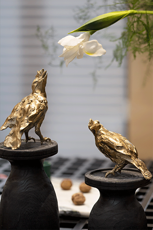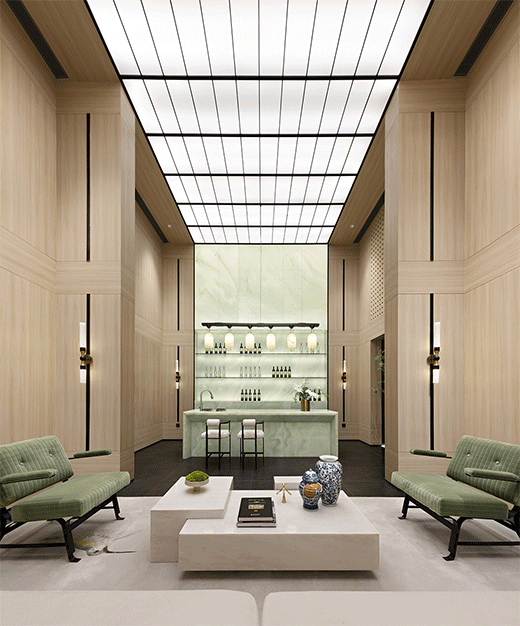 渾然天成的翡翠綠大理石,鋪陳水吧臺與展示架自然靈動的樣貌,厚重的體量感使其呈現雕塑般的美感,細膩的肌理表達空間的寧靜與悠遠 ,自然的藝術在此發揮的淋漓盡致。