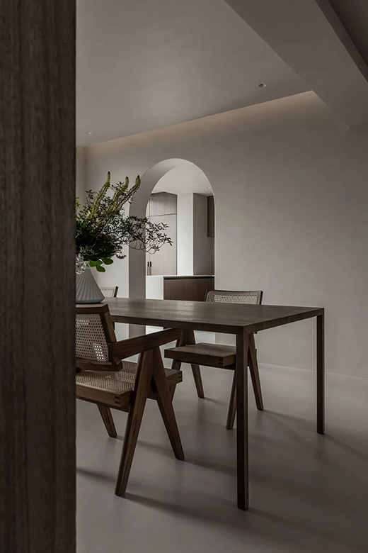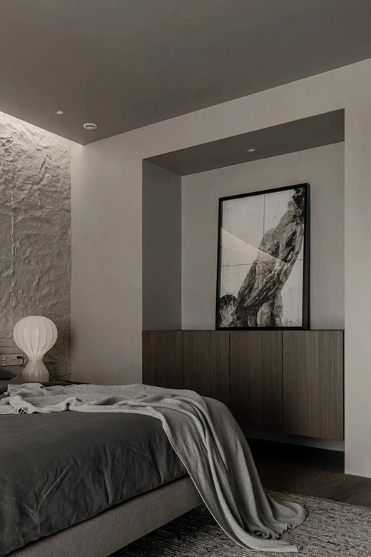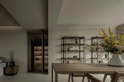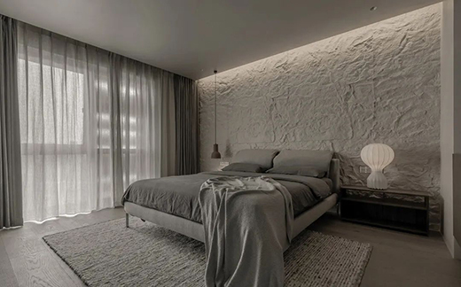 在最樸實無華的空間里,容納淺色及天然材質的沙發,彰顯自然、安靜、禪意的東方美學。紋理質樸的器皿、精細打磨茶幾、獨特紋理地毯,每件物品都能散發出耐人尋味的溫度,在低色溫的燈光渲染下,室內氛圍呈現安靜的和諧感及朦朧感。