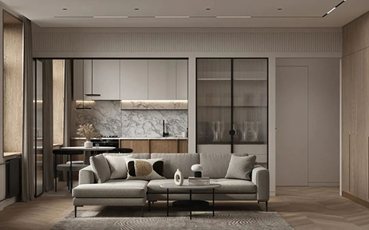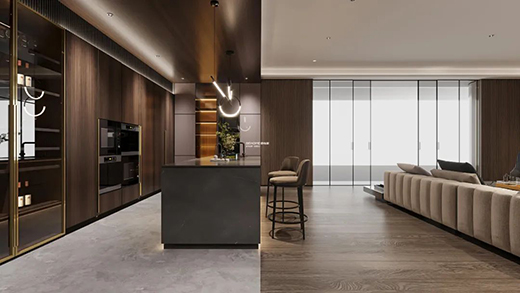 開放式廚房因?yàn)榫邆涓叨鹊目臻g連通性,其整潔與否會影響到廚房的整體顏值,而廚房的物件多且雜,因此在收納上,建議多采用封閉式收納,吊柜+地柜的組合一般已能滿足基本的收納需求。