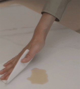 經過一番忙活,耐磨耐刮耐高溫的巖板餐臺擺上了幾盤熱氣騰騰的菜肴,光滑臺面上灑落的油漬,只需抹布輕輕擦拭便能輕松清潔干凈。