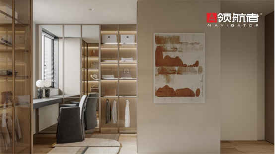 輕奢風在衣帽間又會是怎樣的體現呢?首先領航者家居打造了一體式全透明的可視衣柜,通透敞亮。與獨立式全木衣柜相比輕便感更強,不會產生壓抑感;配合燈光,高級又有質感。這種玻璃衣柜還能防水防潮,密封性良好,是一款更適合現代精英的衣帽間。