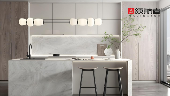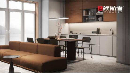 新年廚房煥新,廚房除了電器多之外還有一個重要的物品,那就是儲物柜。如果沒有柜子,東西就沒安放的地方,看起來就會很凌亂。領航者家居通過整體式吊柜收納設計,提升空間儲物能力。吊柜設計既不占地面空間,又實現了儲物與美觀的完美結合。色彩搭配上使用了淺色系,細節用金屬元素來點綴,提升廚房格調,營造實用而美觀的廚房環境。