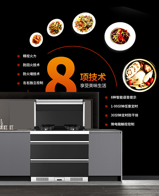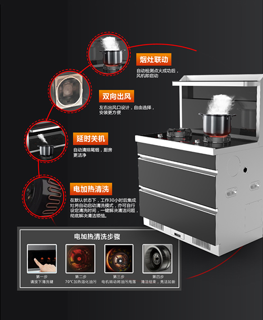A9019具有一鍵聯動、集成運作的功能,輕輕松松 即可實現多重功能區的集成運作:保溫區持續保溫,確保用戶隨時都能吃上一口熱乎飯;油煙機,采用紅日專利技術,實現四重油煙分離,更有人性化設計打造的黃金攏煙區,實現高效攏煙、不跑煙,油煙吸凈率、分離率各可高達99.96%和98%;紅外線灶,采用高效全預混燃燒器,相較傳統大氣灶一年可節省4個月煤氣;保潔柜,既可消毒,又能收納,實現了一柜多用,節省空間的目的;雙出風口,左右出風,自由選擇,人性化設計,操作、安裝更便捷;油杯,采用下置式設計,清潔更方便。