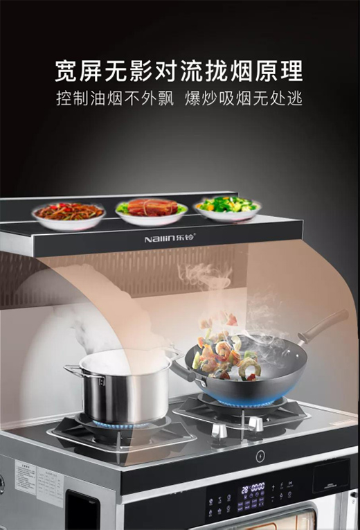 樂鈴多功能一體集成灶在煙機、灶具上的性能表現向來出色。21m3/min增壓大吸力、5.0kW猛火滿足任何類型的爆炒。此外,樂鈴多功能一體集成灶在煙機上還作了進一步升級,利用寬屏無影對流攏煙原理,控制油煙不外飄,爆炒吸煙無處逃。