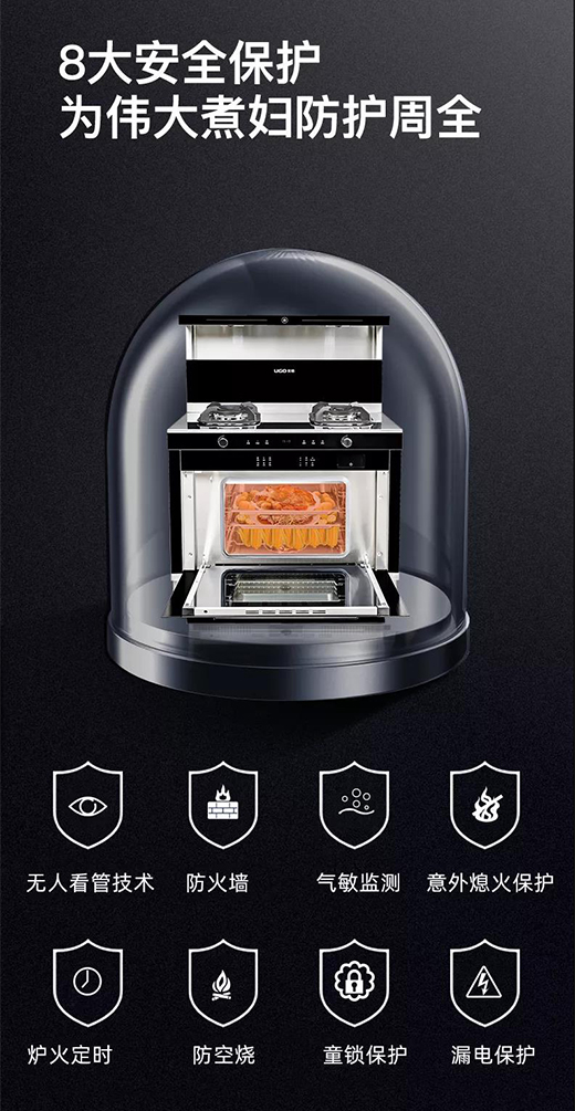 對(duì)廚電而言,安全性是必須保證的基本。優(yōu)格集成灶多重安全防護(hù),空燒報(bào)警、極速防火墻、熄火保護(hù)、氣敏監(jiān)控、安全童鎖、漏電保護(hù)等多重安全防護(hù)墻設(shè)計(jì)給你從一而終的安全感。