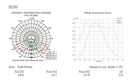 光源:采用飛利浦3030燈珠,高強度進口PC光學透鏡,蝙蝠翼型配光,實現光的均勻分布,大幅度改善照明效果。以80W參數為例: