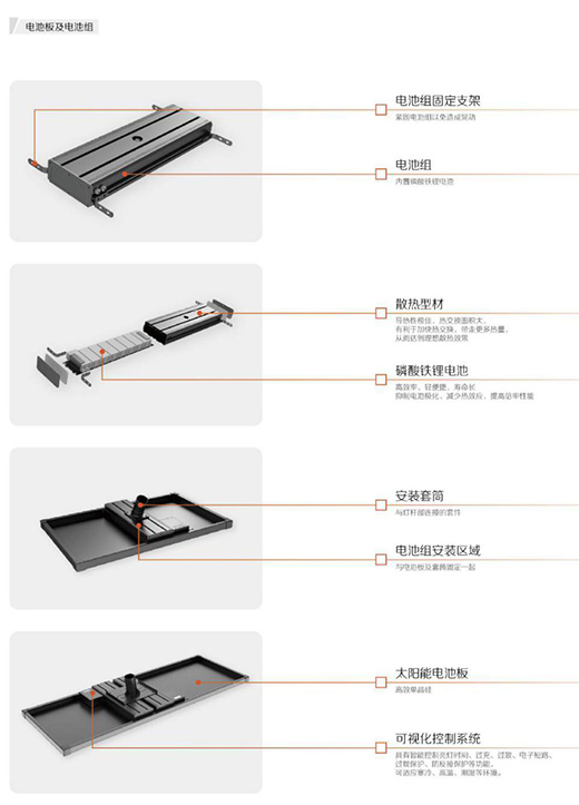 2)電池:好的太陽能路燈要保證充足的照明時間以及照明亮度,要做到這點,對電池的要求自然是低不了,目前太陽能路燈一般為鋰電池。