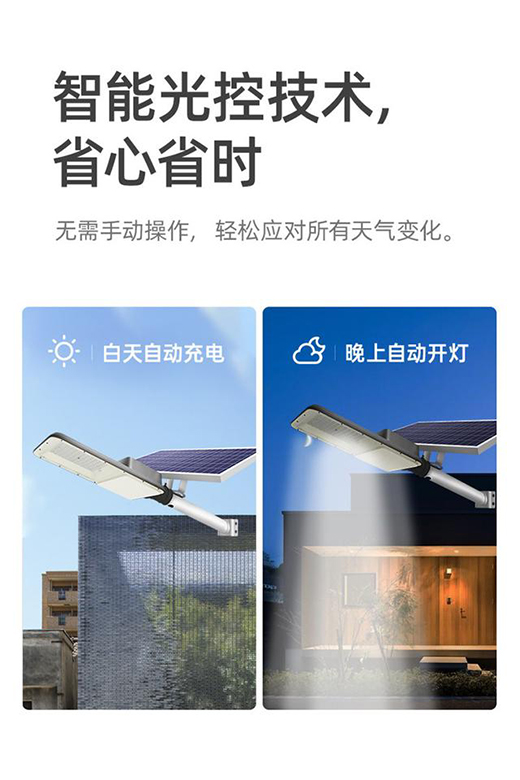 市面上普通的路燈工作時耗能耗電,而這款太陽能光控感應路燈采用了智能的光控技術無需手動操作,輕松應對所有天氣變化,解放您的雙手,白天利用太陽能自動充電,晚上自動開燈,智能的控制亮燈時間,省心省力,買到就是賺到的好路燈!