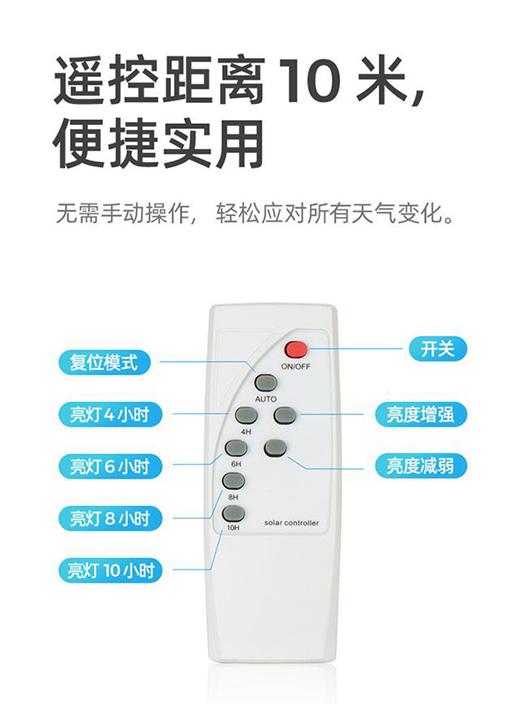 市面上的普通路燈需要人與路燈極近才可以對路燈有所操作,而這款路燈實現遠程操控,方便了您的生活,給您配備了遙控器,遙控距離可達10米,遙控器各種按鈕清晰可見,非常便捷實用,也避免了壞天氣時不愛出去的煩惱,讓您體驗智能便捷的生活體驗!