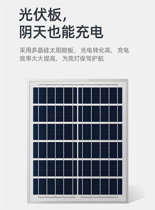 這款路燈采用了多晶硅太陽能板,光電轉化高,充電效率大大提高,多晶硅一般采用鋼化玻璃進行封存,堅固耐用,制作成本低,特殊光伏板,不僅在晴天能充電,在陰天也能充電,太陽能路燈的設計能有效的降低常規能源的消耗,減少耗能耗電,