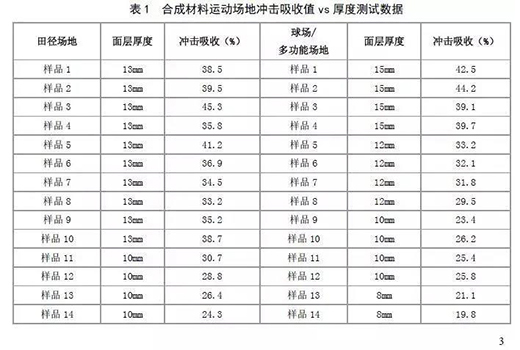在具有同樣材料組成的前提下,合成材料面層運動場地的安全保護性能(沖擊吸收值)與厚度有著近似正比的關(guān)系(見表1)。