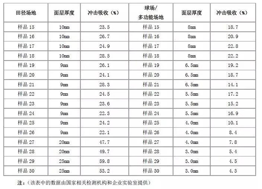 c)其他活動場地,要求其面層平均厚度≥10mm。此要求參照歐盟標準EN 14877-2013《戶外合成材料運動場地技術(shù)要求》的相關(guān)規(guī)定,并保證沖擊吸收值≥25%;