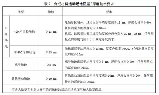 (2)為了保證合成材料面層運動場地能達到相應(yīng)的安全保護性能和耐用性能,本標準結(jié)合現(xiàn)行國家標準和國際標準,對面層厚度作出如下要求: