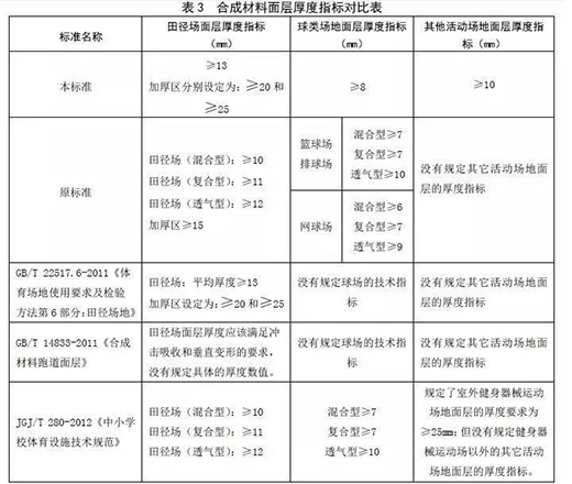 (3) 本標準中合成材料面層厚度指標同其它國內(nèi)相關(guān)標準的對比如表3所示。