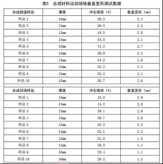 場地面層的垂直變形也不能太小,場地面層垂直變形越小,場地表面就越硬,不利于對運動員的安全保護。歐盟標準EN 14877-2013《戶外合成材料運動場地技術(shù)要求》規(guī)定了田徑場地面層垂直變形值上限為3mm,國家標準GB/T 14833-2011和 GB/T 22517.6-2011規(guī)定了田徑場地面層垂直變形下限為0.6 mm,因此參照以上歐盟標準和國家標準要求,并且結(jié)合實際檢測結(jié)果(見表5),將本標準的垂直變形規(guī)定為0.6 mm~3 mm。
