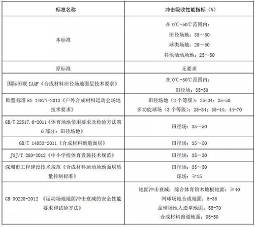 (4)表4是本標準中合成材料面層沖擊吸收性能同其它國內(nèi)外相關(guān)標準的對比。