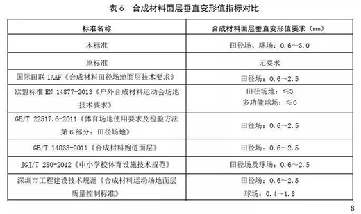 (2)表6是本標準中合成材料面層垂直變形值同其它國內(nèi)外相關(guān)標準的對比。