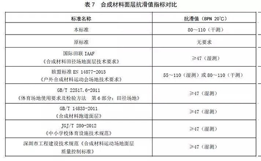 (2)表7是本標準中合成材料面層抗滑值同其它國內(nèi)外相關(guān)標準的對比。