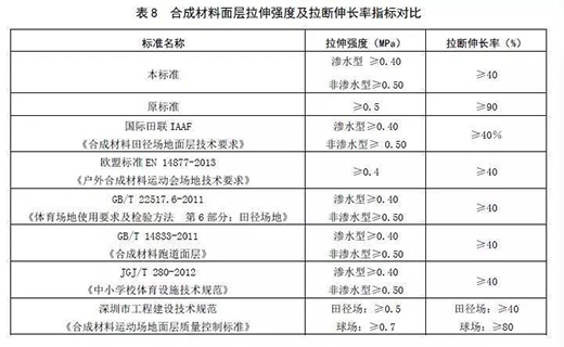 (2)表8是修訂后合成材料面層的拉伸強度及拉斷伸長率同國內(nèi)外相關(guān)標準的對比。