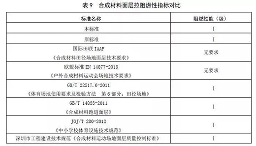 (2)表9是本標準合成材料面層的阻燃性指標同國內(nèi)外相關(guān)標準的對比。