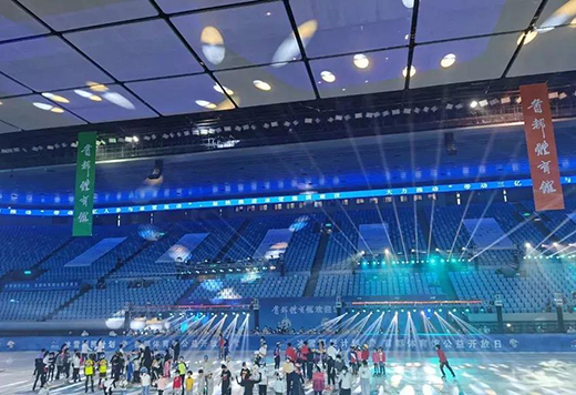 場館采用了最新聲光電技術。通過頂部鋁合金框架結構懸掛36個網格膜,形成了一個1332平方米的巨型投影屏幕,通過最新影像技術可以實現各類動態畫面呈現,配合最新的聲、光、電技術與冰場形成天地一體的視覺盛宴。