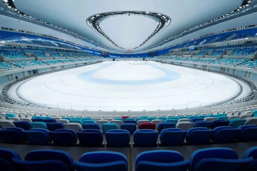2022年冬奧會標志性場館——國家速滑館的設計理念來自于“冰和速度相結合”的創意,沿著外墻曲面由低到高盤旋而成的“冰絲帶”,就像速度滑冰運動員高速滑動時留下的一圈圈風馳電掣的軌跡。冰上畫痕成絲帶,22條“冰絲帶”象征著北京2022年冬奧會。