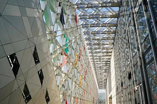 “冰絲帶”為晶瑩剔透的夾膠彩釉彎弧玻璃,營造出輕盈飄逸的絲帶效果,整體造型新穎別致,未來感滿滿。