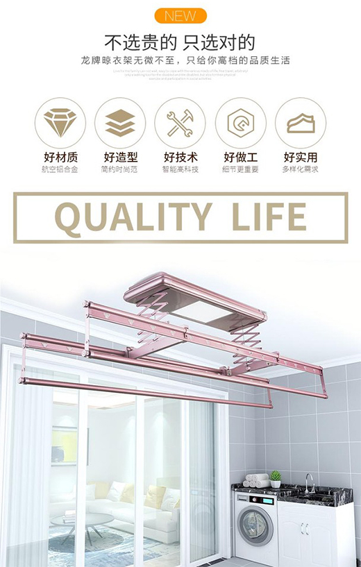 “中國晾衣架十大品牌”龍牌讓你不用擔心雨天衣服曬不干的問題。風干/風干功能允許你在雨天穿溫暖干燥的衣服。紫外線會幫助你去除衣服上的細菌,保護你和你的家人。節能照明讓你害怕黑暗。遇到障礙物時的緊急停止功能讓您在陽臺上玩耍時不用擔心孩子的安全,因為選龍牌,所以更加無憂無慮!