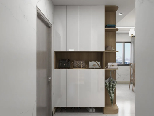 原木色柜體配上白色柜門是最好的搭配方式,純白色的柜門簡單大方,原木色的柜體親近自然,兩者相結合從視覺上更加融洽。玄關柜設計圓弧開放式邊柜,不僅可以放些雜物,還可以使邊角過度的更加順暢。