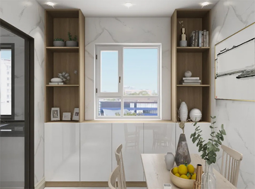 設計餐邊柜可以增加更多的儲物空間,餐邊柜的樣式可根據自己的喜好進行設計。這個方案由于過道狹長,所以將餐邊柜設計于窗前。兩側高柜可以放置更多物品,但對于采光可能有一定的影響,所以,做矮柜也是不錯的選擇!