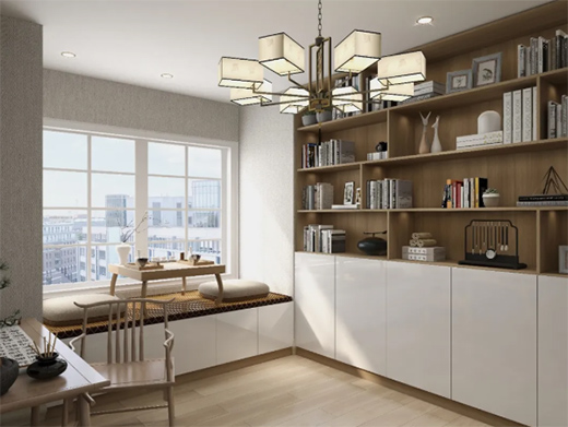 書房根據其房型,設計了一個飄窗柜,閑暇時間坐在上面喝喝茶,下下棋,聊聊天都是不錯的選擇。