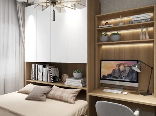 次臥面積過小,正常放置只能容納一張床,所以,可設計榻榻米增加空間利用率,榻榻米柜設計下虛上實,便于放些書籍,雜物等。旁邊還可以設計寫字臺,空間雖小但五臟俱全。