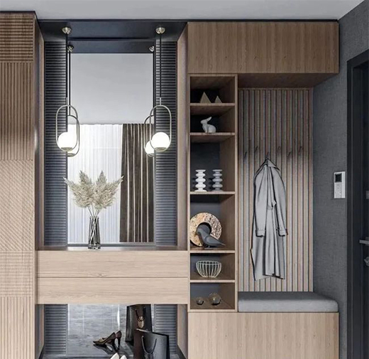 入墻式設計,底部柜子放鞋襪、中間鏤空區掛衣飾,其間開放格一邊能坐,一邊還能擺放收藏物和綠植,功能分區清晰,非常符合年輕80、90回家進門習慣。