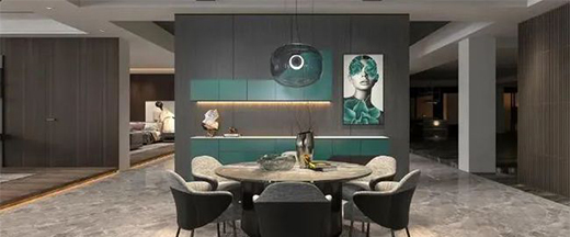整體選用高光色莫蘭迪深綠,如瓷器般素雅的綠色與淺色木紋相互交錯,搭配不規則柜體設計,讓設計與品質生活完美融合,讓用餐空間大氣而不失雅致。