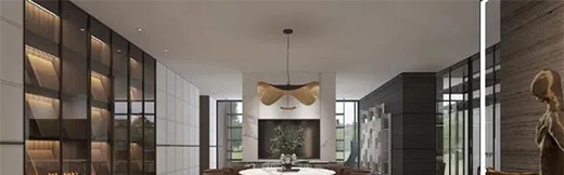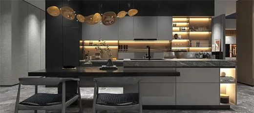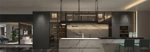 輕奢極簡系列全鋁櫥柜運用金屬元素,配以大理石紋路點綴,一排黑框玻璃的酒架讓廚房空間變得優雅有儀式感。