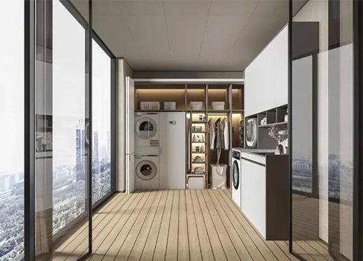 陽臺設置洗衣機柜、開放收納架、吊柜、烘干機雙層疊放柜、洗手臺等等,可實現集洗漱、晾曬、收納、展示于一身,實用性滿分。