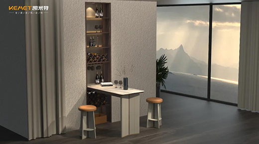 吧臺:帶小酒柜的吧臺,置于餐廳或客廳一面墻,用于家庭小情調(diào)小酌兩杯,外形簡約大方,呼應(yīng)于系列元素,采用巖板與木結(jié)合的臺面提高時尚度和檔次,同時也方便于清潔。