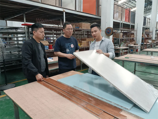 為了更深入地了解全鋁家居材料應用和新品進度,華鋁家居總經理吳新軍來到了紅企鵝智能鋁家居。紅企鵝智能鋁家居營銷負責人盧毓亨熱情地接待了吳總一行,向吳總介紹了紅企鵝智能鋁家居的專利產品——多層鋁蜂窩板,以及該產品在全鋁家居門板、全鋁家居柜子和鋁門的應用。吳總認為,這類特色產品均有獨特的應用范圍和人群,能夠豐富全鋁家居行業生態,值得鼓勵和支持。