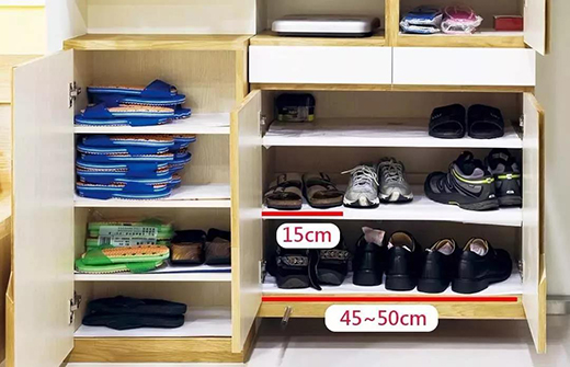 擱板到底要做多寬?一般來說,以15厘米為基準,如果一排要放下三雙鞋,寬度則在45~50厘米左右。