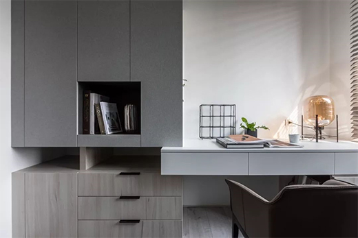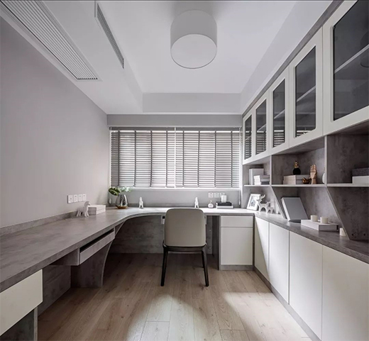 三、定制柜與書桌交錯在定制全鋁收納柜的末端,交錯地裝上全鋁書桌,這樣讓空間的利用更加透徹,最大化地實現收納與辦公的空間。