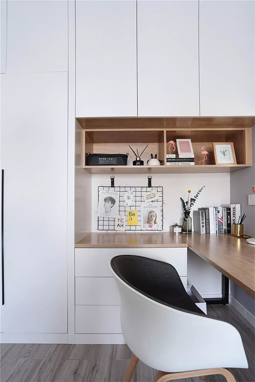 二、收納柜+書桌組合在收納柜的中間位置,留空一個擺放書桌的位置,把全鋁書桌卡進柜體里面,這樣的設計也是非常的巧妙實用,能為小房間擠出辦公功能,還可以布置一張沙發床,讓空間日常保持寬敞。