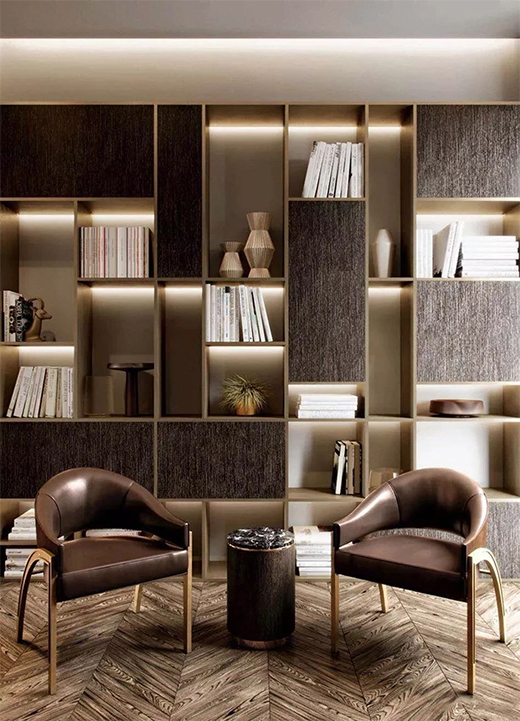 金屬和玻璃質地的給人感覺比較現代時尚;深色的全鋁書柜則顯得厚重沉穩,比較有內涵;淺色的全鋁書柜給人清新、自然、明朗之感,也比較容易搭配;深色的書柜則更有安靜、厚重之感,比較凸顯文化氛圍。
